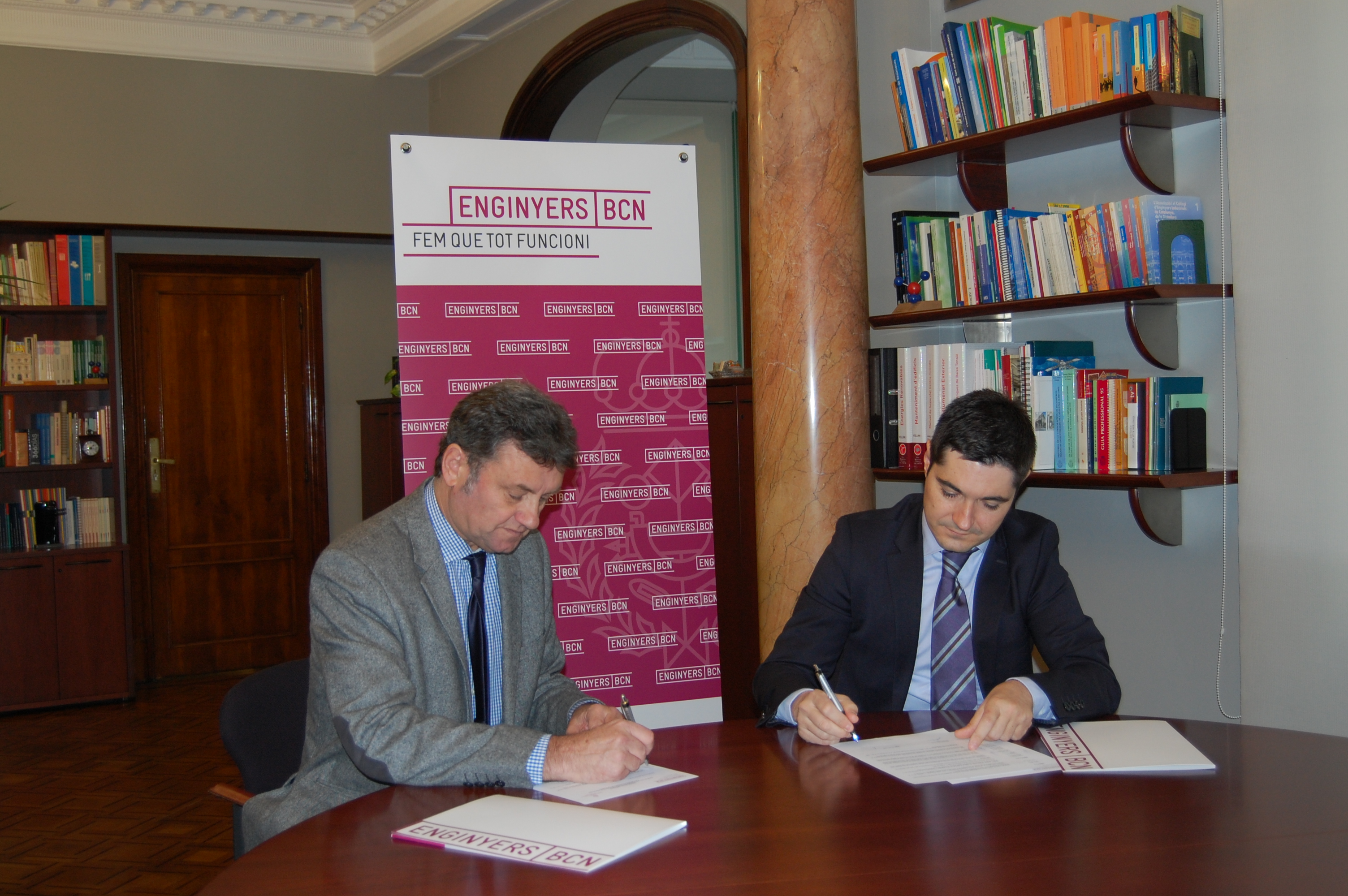 A l’acte de signatura del conveni de col·laboració, que ha tingut a les instal·lacions del Col·legi el dia 12 de desembre de 2013, han assistit el degà del Col·legi d’Enginyers Tècnis Industrials de Barcelona, Miquel Darnés i Cirera, i el director de la Fundació Politècnica de Catalunya, Ignasi del Río.
