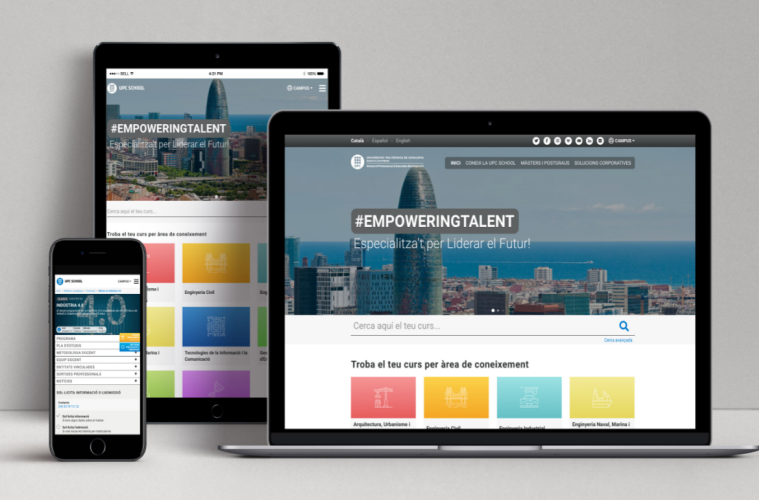 En la nueva web de la UPC School se han aplicado los principios del responsive web design, de manera que la configuración de la página se adapta automáticamente a la pantalla o navegador con el que se esté visualizando (tableta, ordenador de sobremesa o móvil).